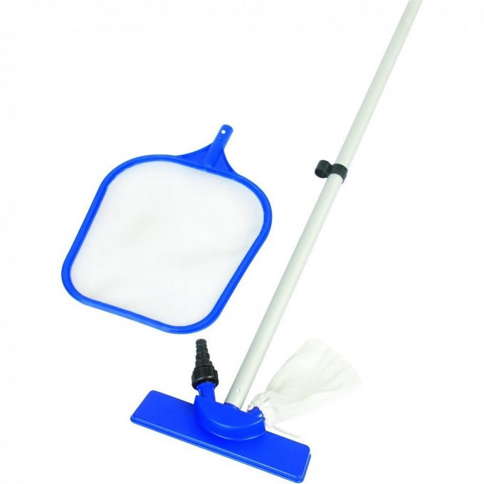 Набор для ухода Bestway 58013 поможет в борьбе с загрязнениями образующимися на внутренних стенках, дне и водной глади бассейна. Набор для очистки бассейнов — это необходимый инвентарь, который должен быть у каждого обладателя каркасного или надувного бассейна. С ним вы затратите меньше сил и времени на очистку, а сам процесс пройдёт легко и приятно. Набор состоит из алюминиевой телескопической трубки, с помощью которой вы сможете достать даже до самого дальнего угла бассейна, вакуумной щётки с прозрачным сетчатым мешочком для сбора мусора под водой, а также сачка для улавливания крупного плавающего мусора, например листьев, травы и прочего.